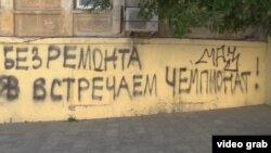 Как в подтверждение – надпись на улице Баумана: "Дом не ремонтировали 100 лет! Встречаем Чемпионат мира".