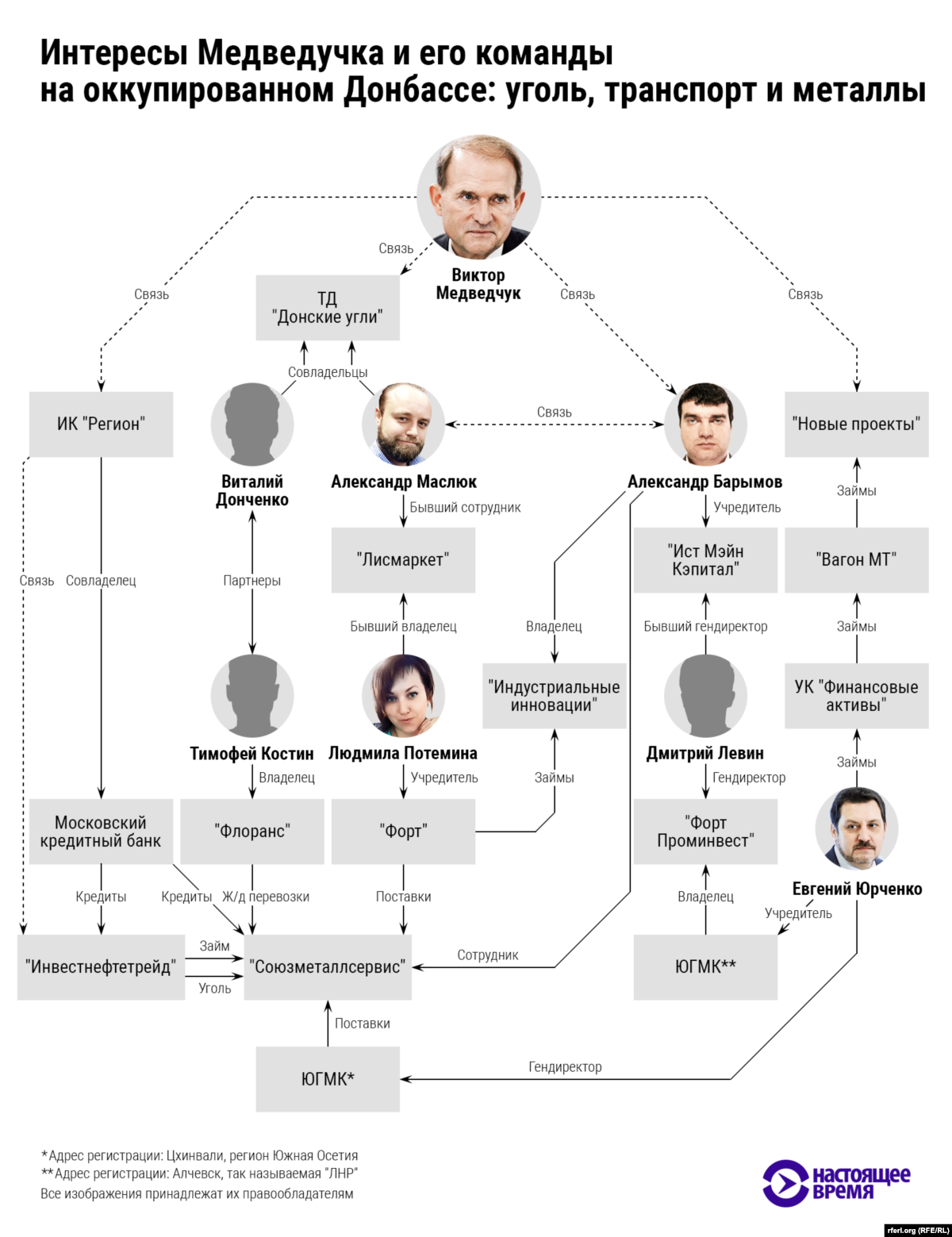Оба партнера Юрченко, в свою очередь, связаны с инвесткомпанией "Регион", с которой хорошо знаком Медведчук. У кума Путина и нового хозяина Донбасса тоже есть пересечения. В бизнесе Юрченко участвуют люди из команды Медведчука, а материнская для "Союзметаллсервиса" компания является финансовым донором для фирмы-прокладки, через которую деньги поступают в бизнес, связанный с Медведчуком.