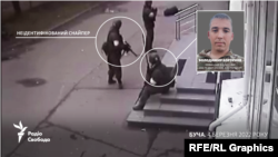 На одном из кадров с камер наблюдения военнослужащий российских вооруженных сил стоит у подъезда дома на улице Яблонской и держит в руках снайперскую винтовку "Винторез". Рядом с ним на лестнице сидит и говорит по рации сержант Борзунов: