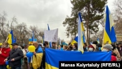 Митингующие держали в руках украинские флаги, люди кричали "Украина, жасасын!" ("Да здравствует Украина"), "Нет войне", "Путин, Гаага, тюрьма!" На плакатах – призывы остановить войну, остановить Путина. На некоторых написано, что "следующим будет Казахстан, если не остановить войну сейчас".